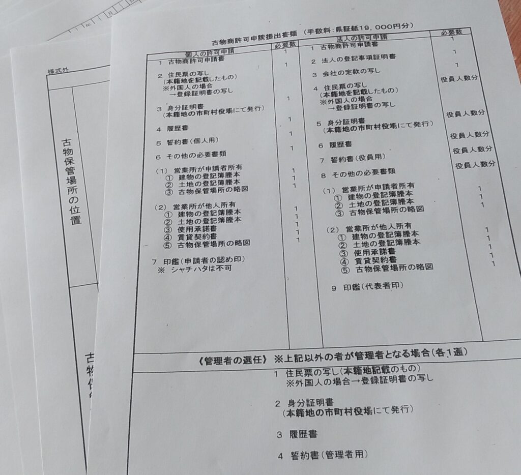 古物商許可申請書の他に、住民票写し、身分証明書、履歴書、誓約書、その他で、営業する建物土地の登記簿謄本、その保管場所の概略図を書く用紙まであり、提出書類は全部で8枚くらい要るようです。